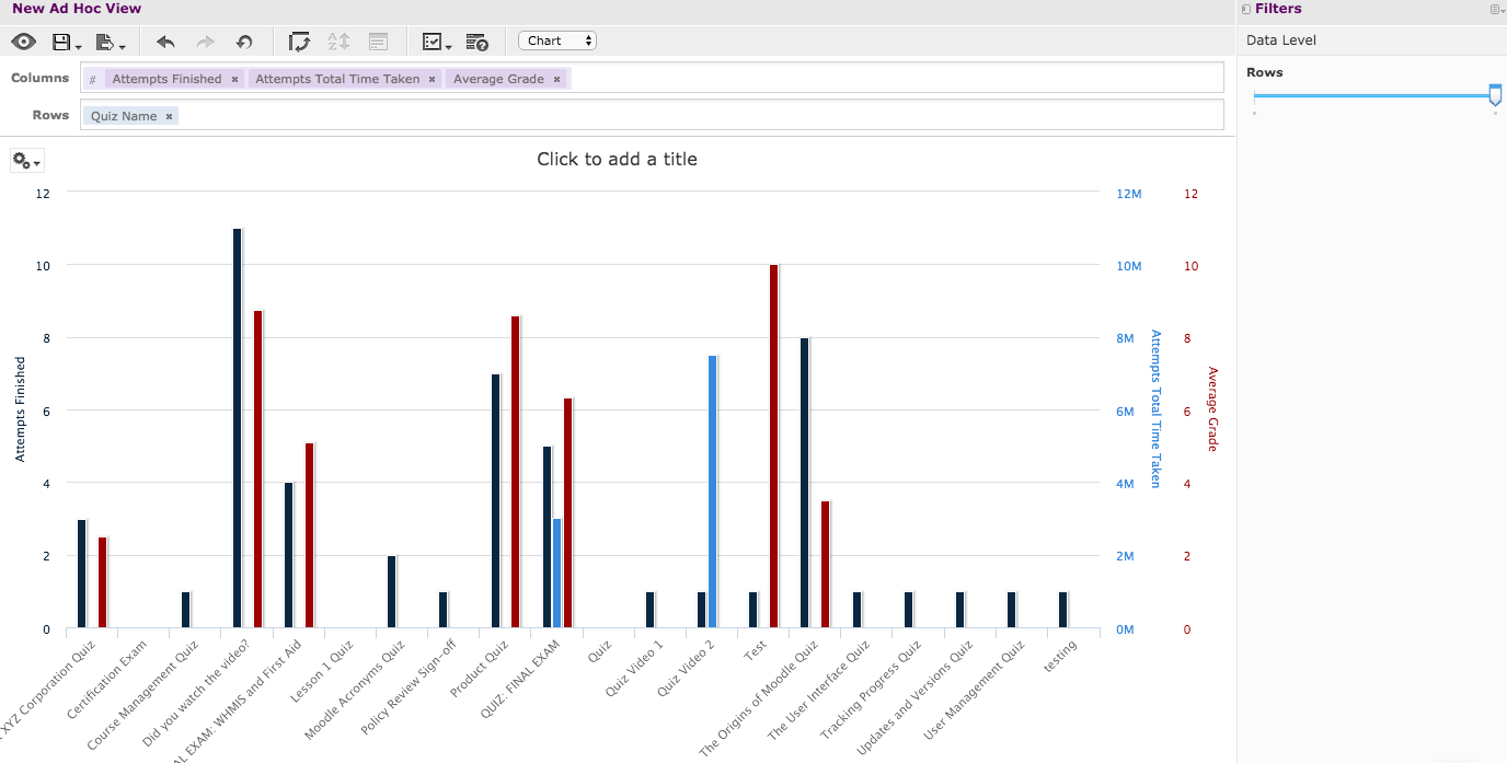 You will now see a completed basic Multi-Axis Chart of your number of finished quiz attempts, total time taken, and average grade of quizzes. Note the color-coded additional axes: