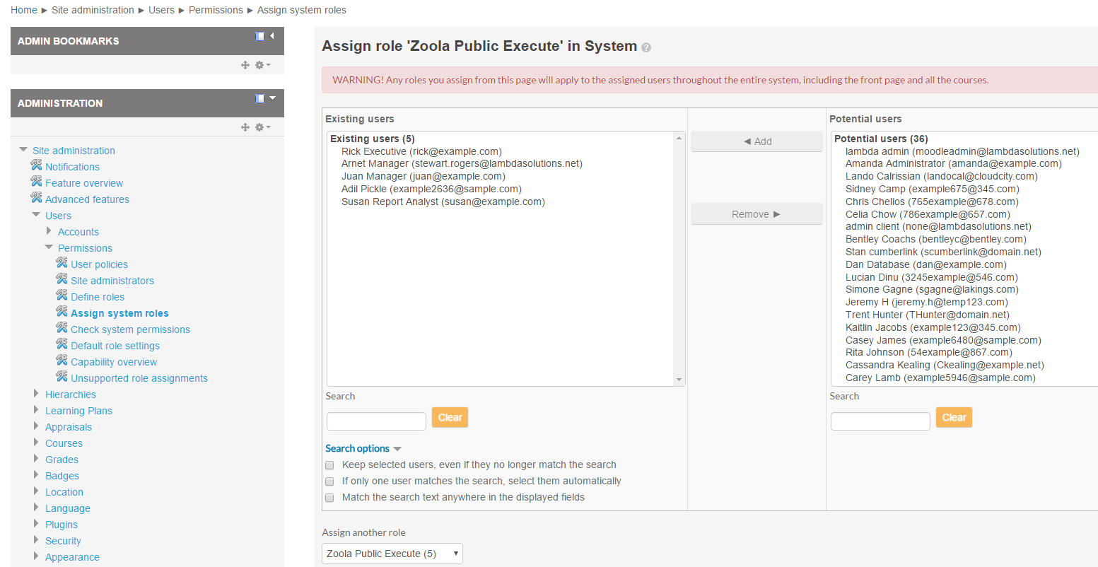 From the Role column, select a Zoola™ role. For information on the Zoola™ roles available in Moodle/Totara and how they correspond to roles in Zoola™, see the LMS Zoola Roles section. Once you select an Zoola™ role, a window will open named “Assign role “role name” in System.”