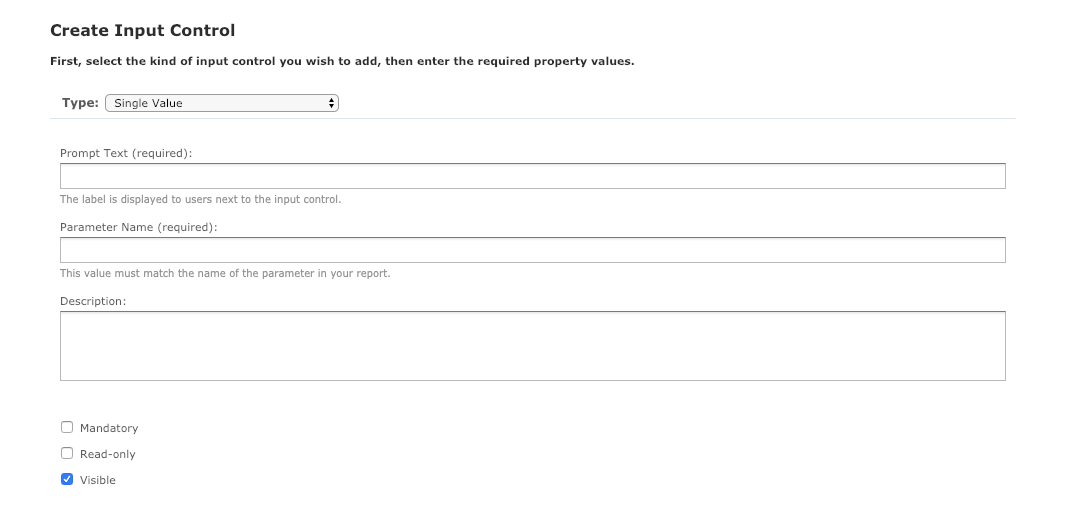 - When logged into Zoola, follow this URL (https://zoola.io/app/flow.html?_flowId=addInputControlFlow&ParentFolderUri=%2FReports) to be taken to the Create Input Control workflow.