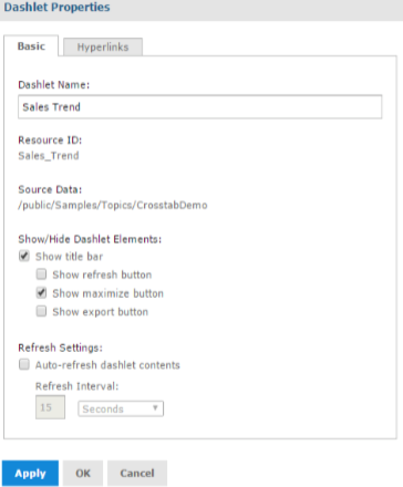 Show/Hide Dashlet buttons: select or deselect to show or hide the Apply button or Reset button.
