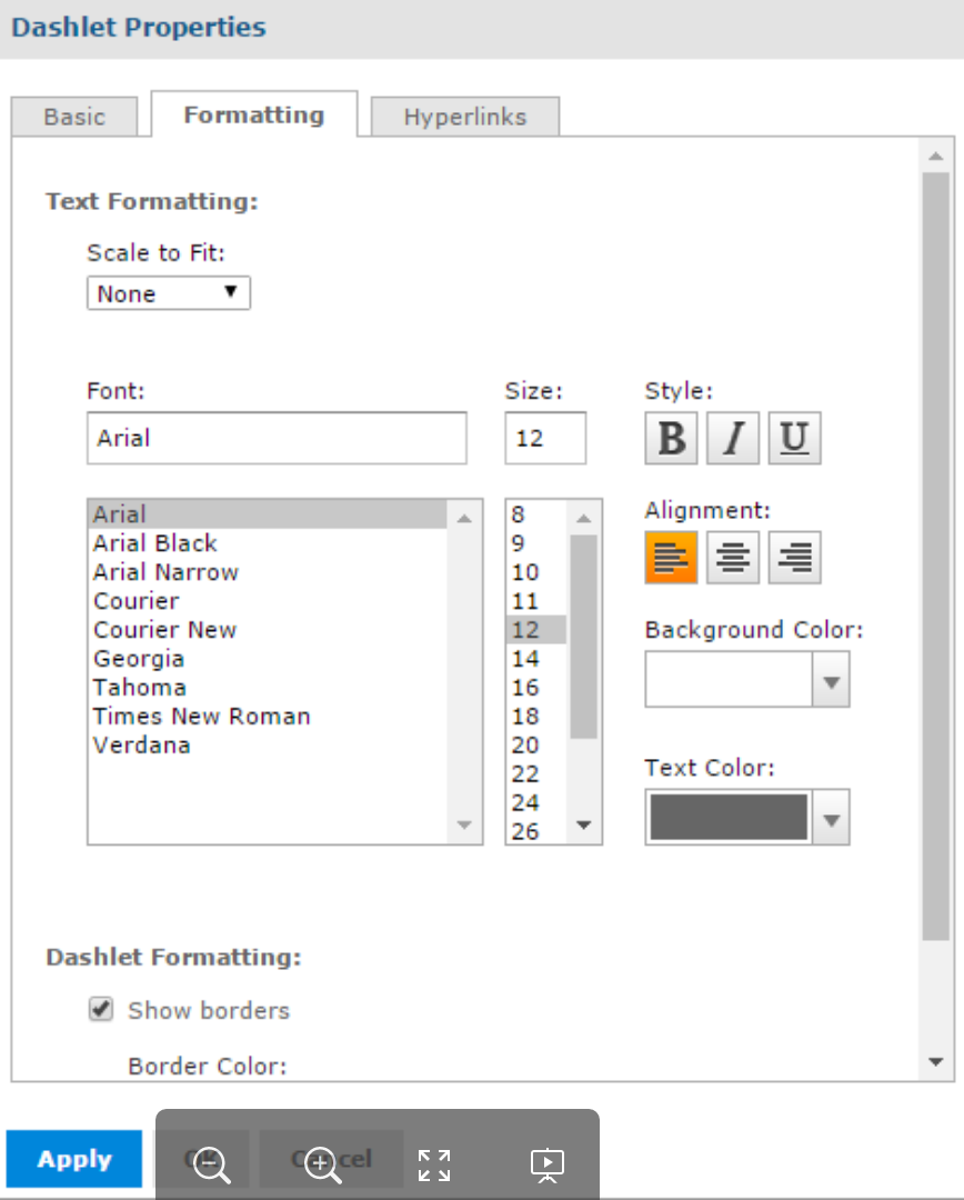 - Font: Use the selection lists and buttons to set the font, font size, font style, alignment, and font color for the text displayed in the Dashlet.