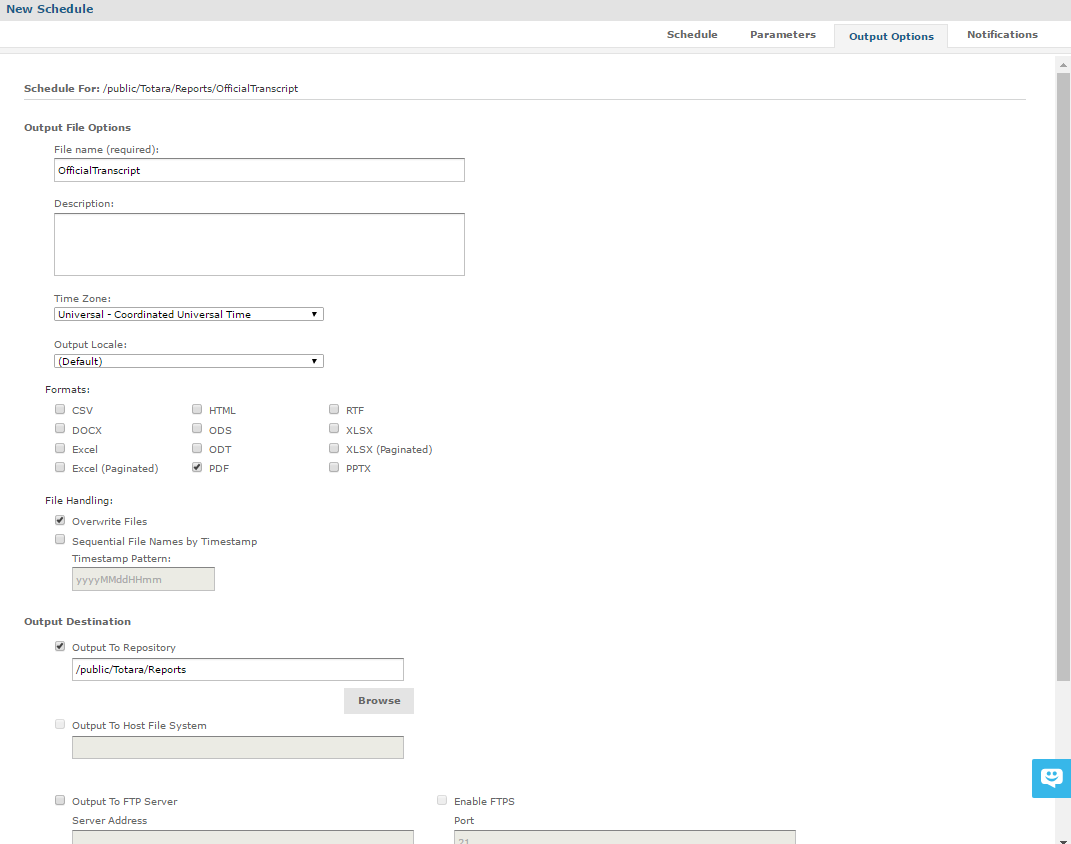 The Output Options tab allows you to determine the output format of the Scheduled Report or Dashboard, as well as the associated description and information.