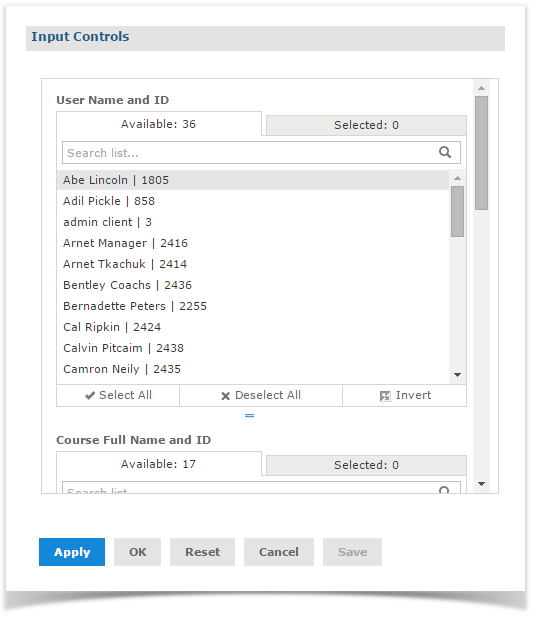 To explore multi-select input controls, we will open up and filter the Quiz Questions Summary Data Report. To run this Report with multi-select input controls, complete the following steps: